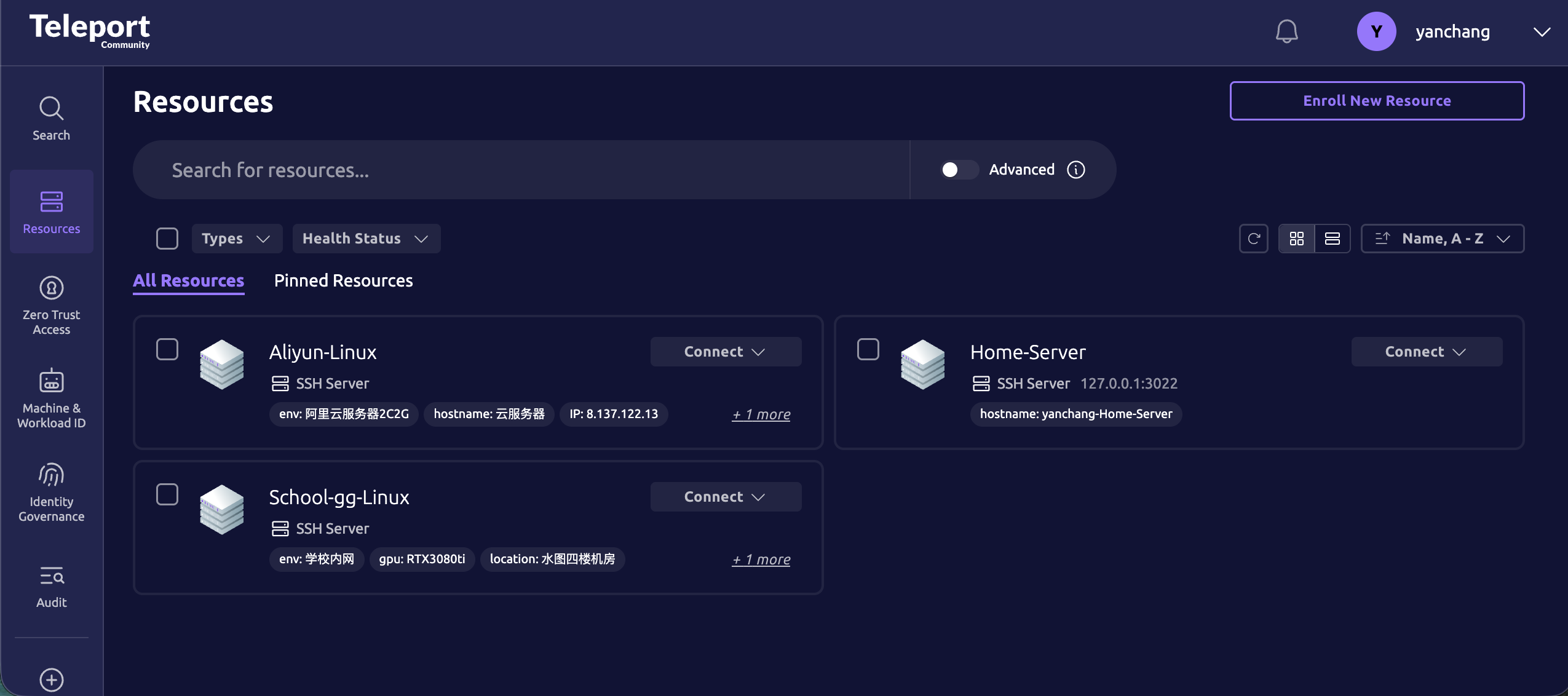 现在,无论你在哪里,只要打开浏览器访问家里的 Teleport 域名,点击 Connect,就能瞬间通过 Web 终端控制学校的服务器。你甚至可以把 ssh_service 下的 commands 配置起来,让它每分钟自动上报显卡温度或 CPU 负载,直接在服务器列表页展示监控信息!