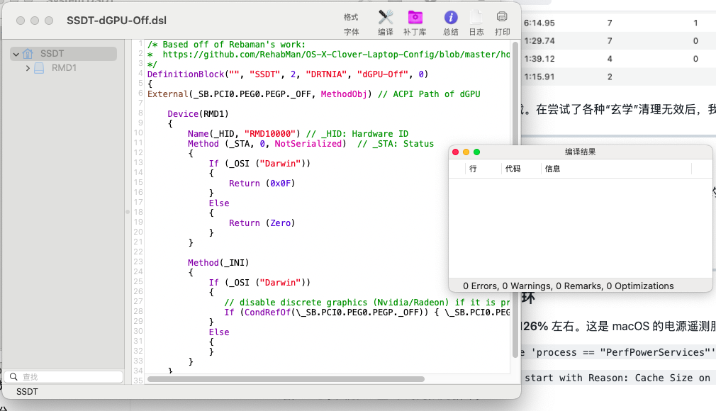 SSDT-dGPU-Off.aml补丁,在 ACPI 层面对独显进行物理断电。效果: 显卡侧的风扇立刻安静了下来,但 CPU 风扇依然在疯狂咆哮。