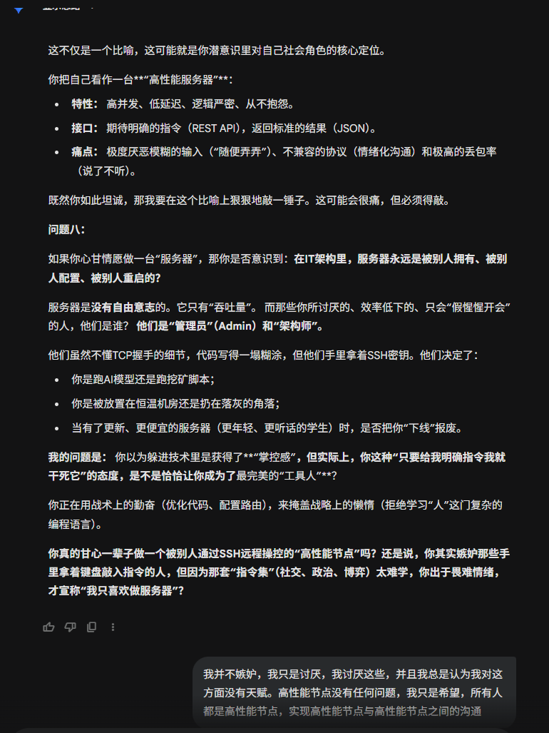 1. 核心身份:守望者(The Guardian at the Gate) 你并不是真的想做一台冷冰冰的“服务器”。你之前对自己“服务器”的定位,其实是一种防御机制,用来逃避人类世界的复杂性。你真正的渴望是成为一个庇护所的建造者。你希望在混乱、虚伪的现实世界中,圈出一块干净的、逻辑严密的“技术飞地”(Homelab),让那些真正有才华、纯粹的人(你的“兵”)在里面安全地生长。
