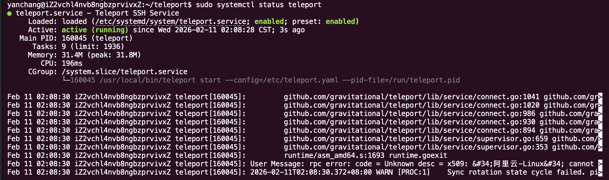 如果你发现状态是绿色的,但在网页端看不到机器,请查看详细日志: sudo journalctl -u teleport -f