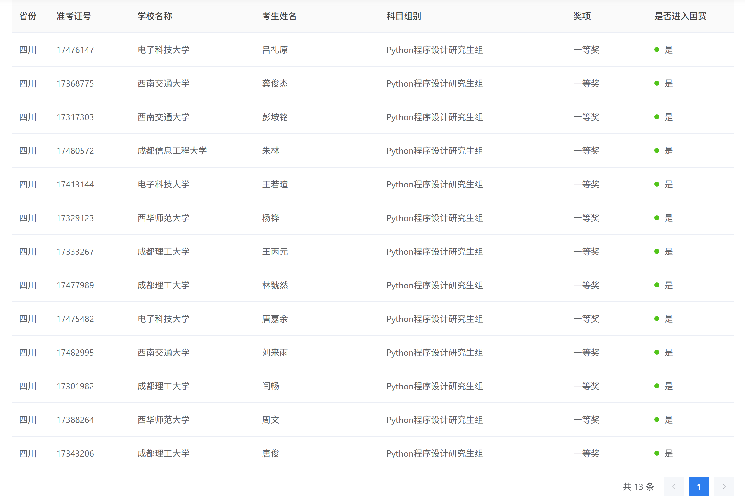 真的很难说,这个研究生组是更卷了,还是更不卷,哎服了。四川省共有十三个省一。说实话,这个人数还挺少的,可能是python组确实是简单了一些。