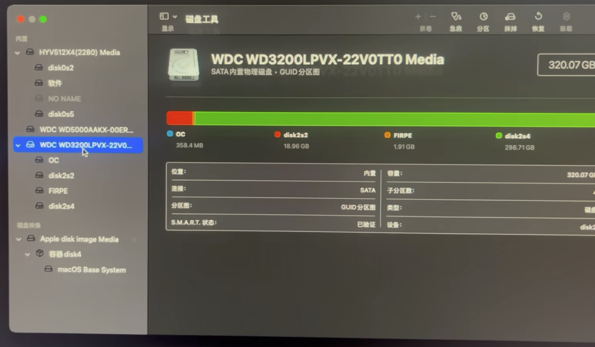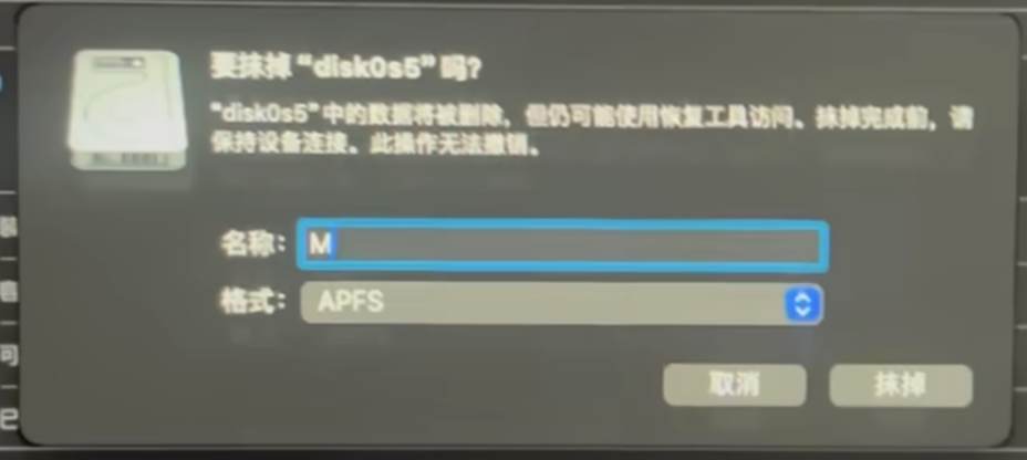 然后选择自己准备的空闲分区,点击抹掉,分区格式为APFS,名称可以命名为MAC,点击抹掉。