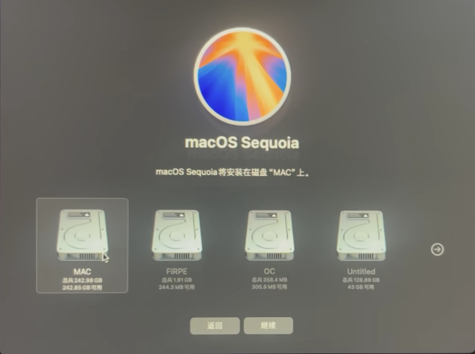 然后返回上一步选择安装MAC OS,点击继续按照提示完成安装,其中选择安装位置,选择刚刚抹掉重建的的分区,也就是MAC分区,然后耐心完成安装就好了,安装完成后根据提示填写资料创建用户即可。