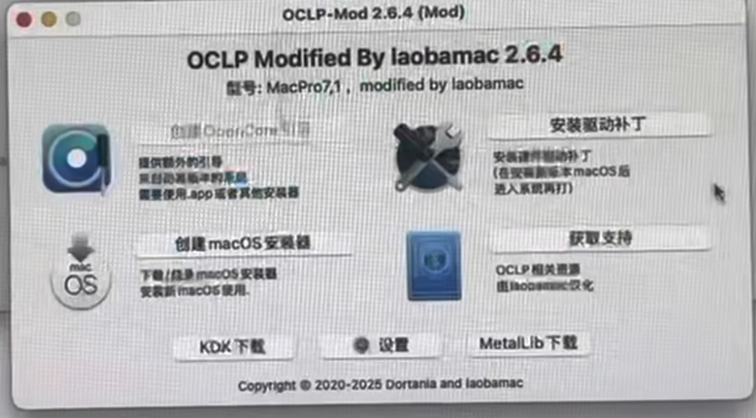 进入系统后,如果是驱动没有安装可能会壁纸为白色,WIFI模块不能使用等问题。因此插入U盘或者在WINDOWS下提前下载好oclp-mod驱动安装工具。安装后在应用程序中打开(如果禁止安装了,在设置里面找一下,会有允许安装)。点击安装驱动补丁