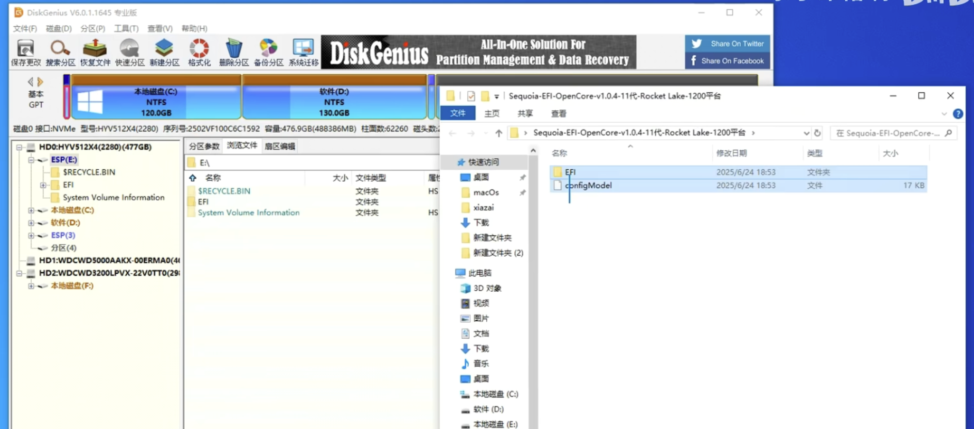 如果是使用的U盘安装的,那么拔掉U盘将会导致无法找到引导文件直接进入默认的系统,无法进入MACOS,因此还是打开DiskGenius,在系统默认引导分区的EFI(注意提前备份)将桌面生成的文件夹所有内容拖进去,如果相同直接替换(注意备份)