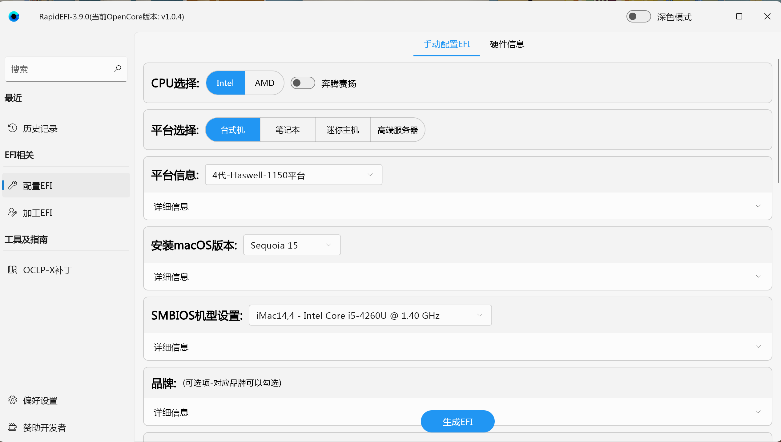 选择自己的CPU类型、平台类型、选择MAC版本如果安装15.5那就默认Sequola 15、其中SMBIOS机型设置,如果是棉驱的A卡要把后方的开关打开。品牌如果有品牌的话就选择,后面的特殊主板如果囊括了你的主板那就选择上。