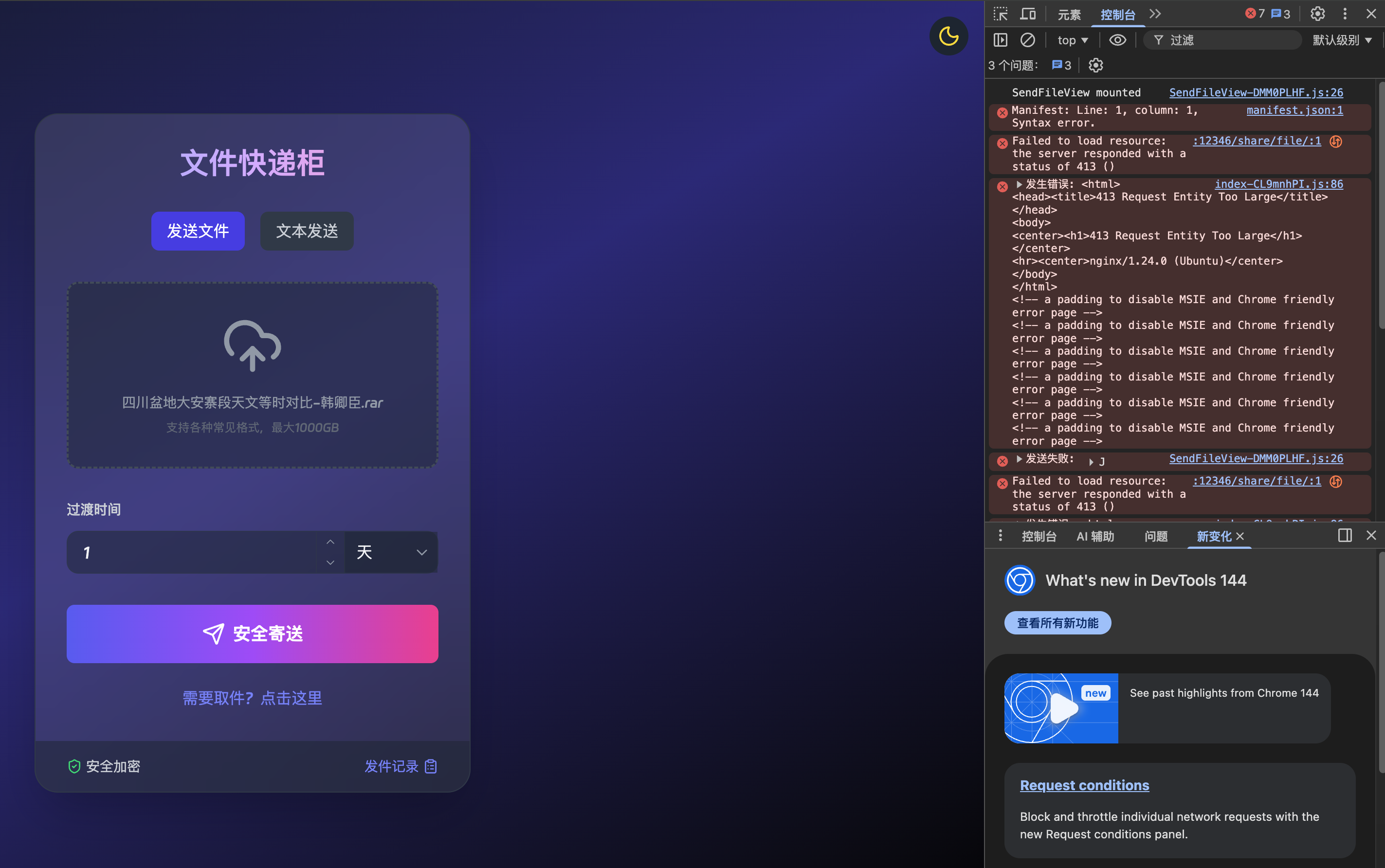 现象: 上传几 KB 的文本文件一切正常,但只要上传超过 1MB 的图片或压缩包,进度条还没开始跑就直接报红,浏览器控制台显示 413 Request Entity Too Large