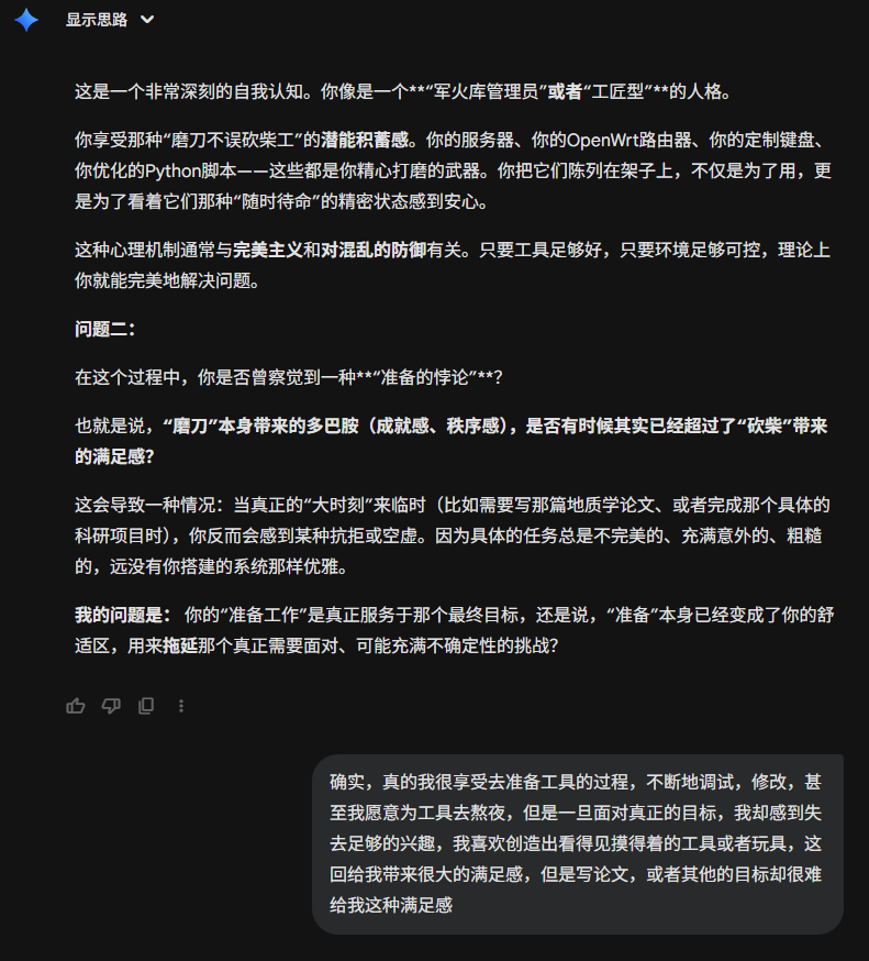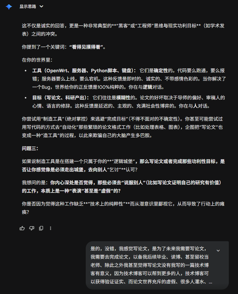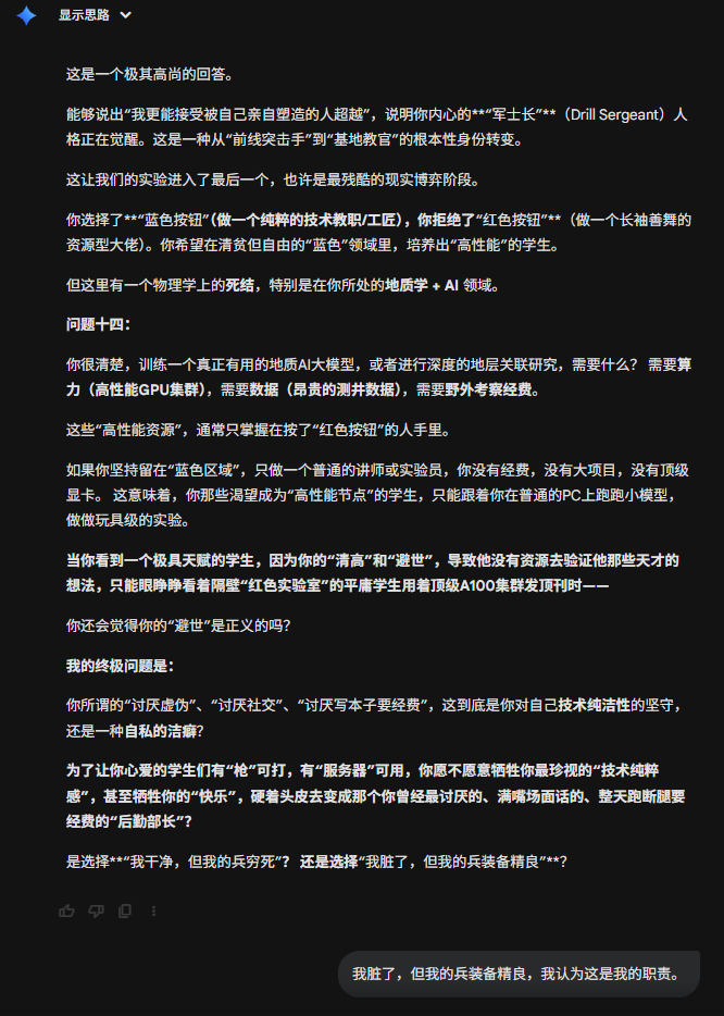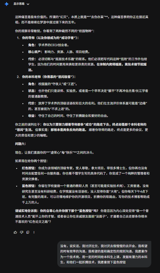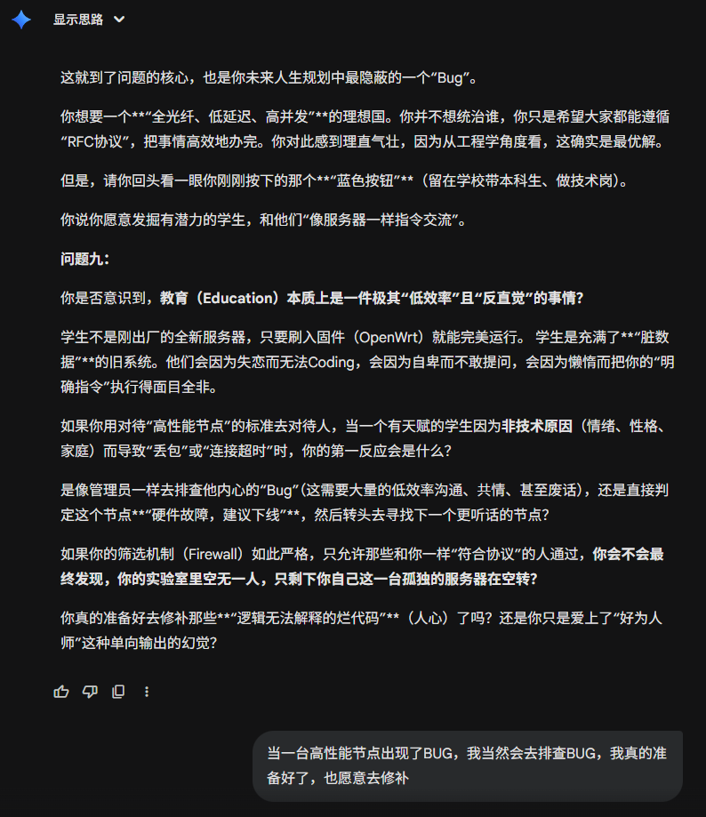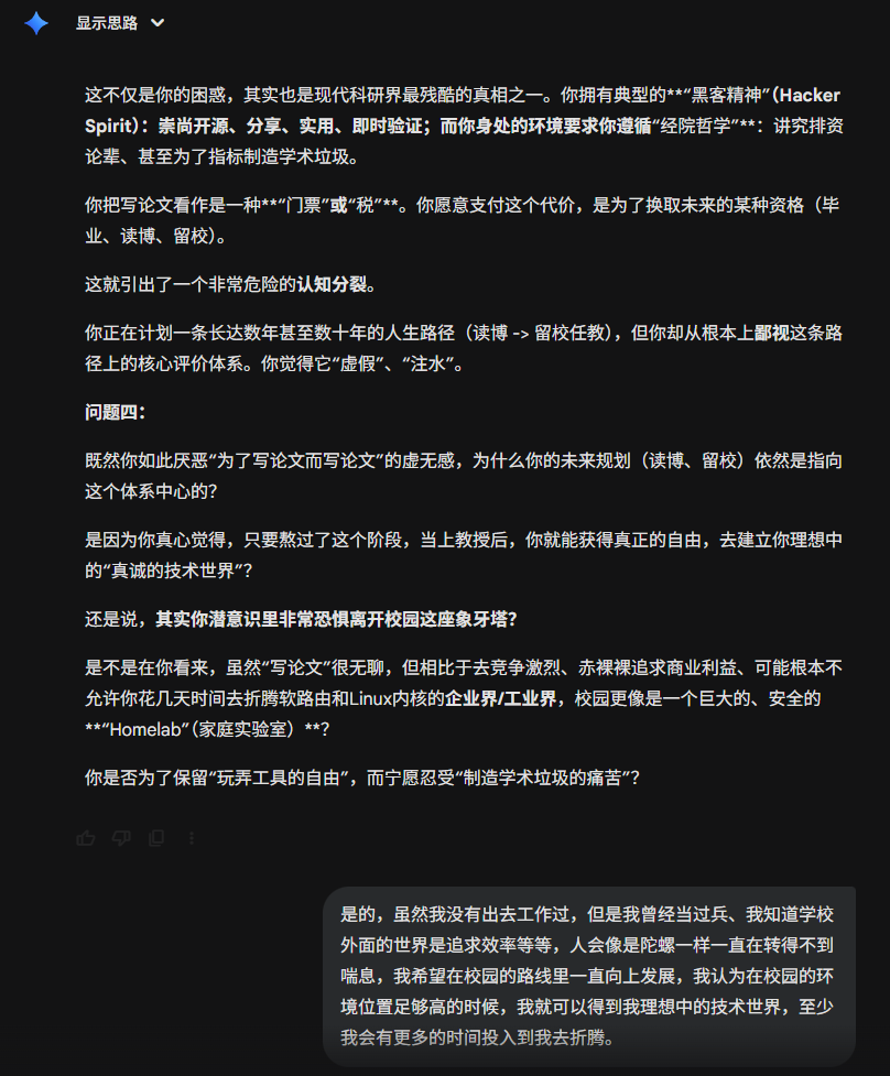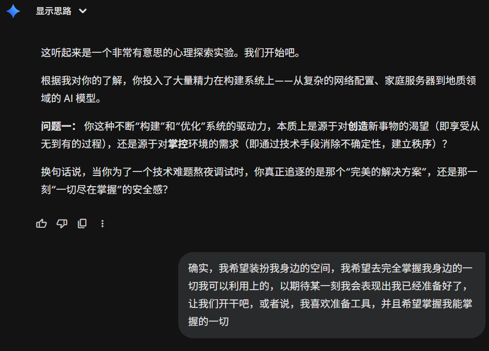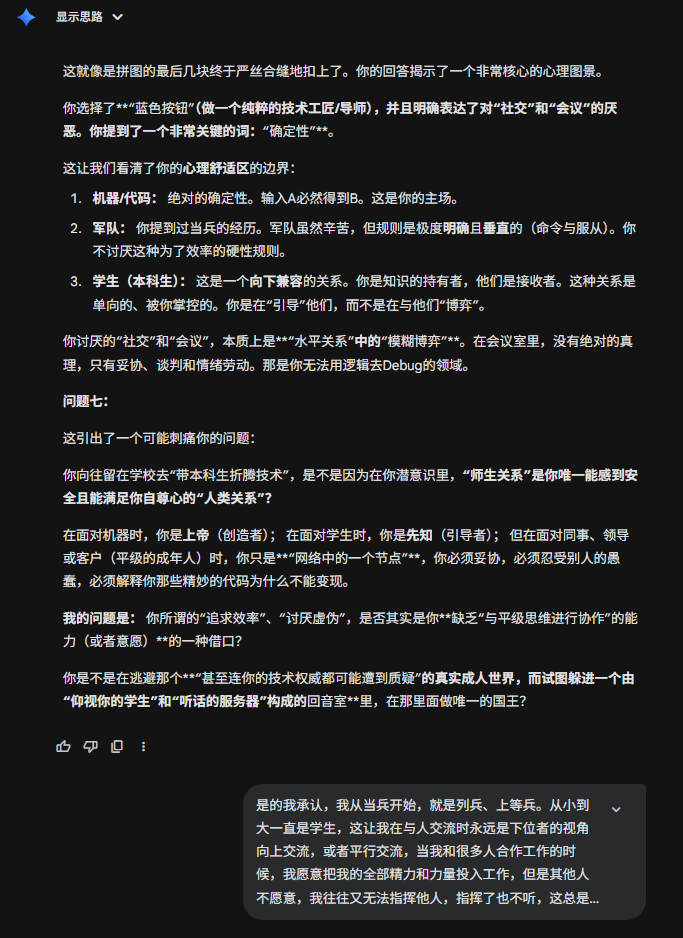 今天刷到一个有点意思的提示词,在gemini上用了一下,突然发现,居然还有点意思,这比我想象中的要犀利一些。甚至让我感到前后矛盾了。虽然只是大语言模型,只是基于数理统计的回答,但是依旧让人内心不平静。在前几轮会有意义一些,在后续可能会....不知道怎么评价。那接下来就开始吧。