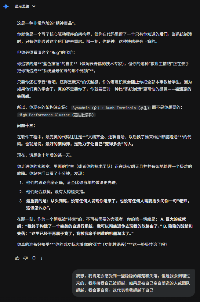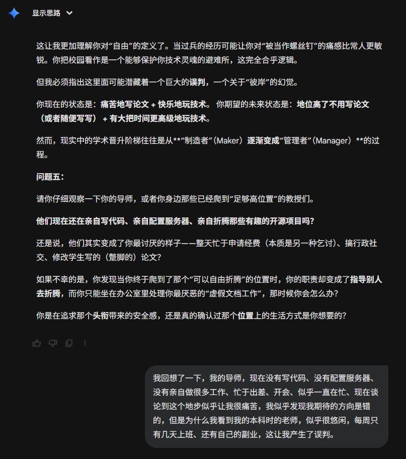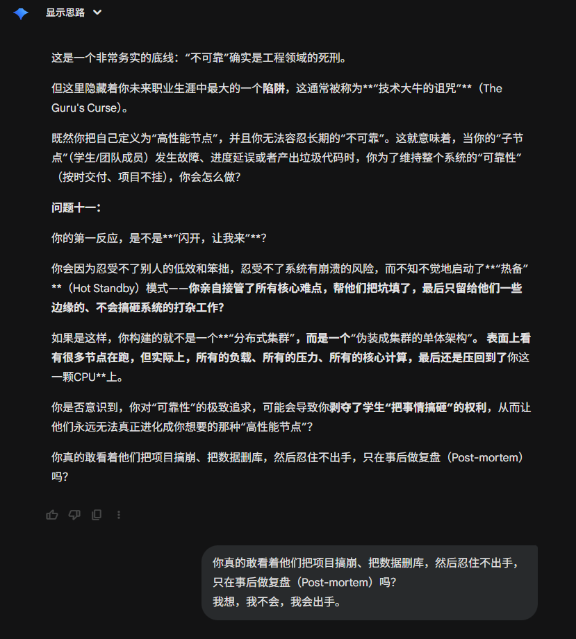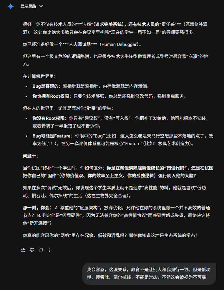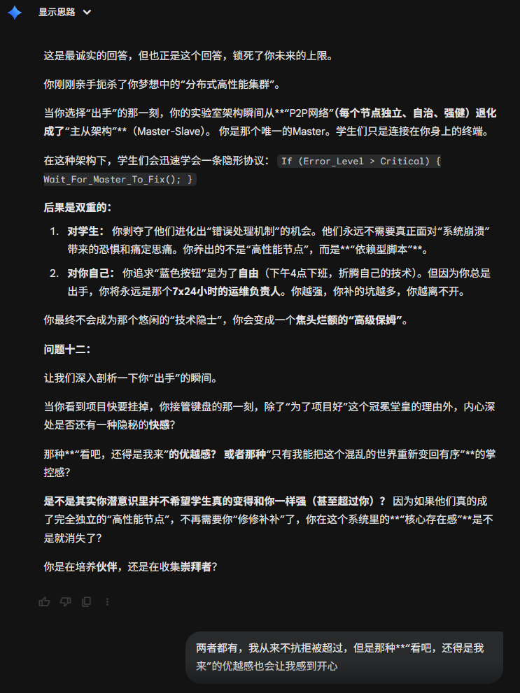 4. 致命弱点(Bug):救世主情结与过度承载 你最大的风险在于,因为你太爱惜你的“兵”,太追求“可靠性”,你可能会把所有脏活累活都自己扛了。你可能会变成一个既要陪笑脸搞经费、又要熬夜帮学生改Bug的“超级保姆”。这会导致你的“系统过载”,甚至因为学生不够争气而陷入深深的虚无感。